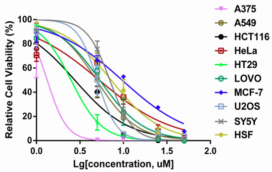 Figure 2. Cell viabilities of cell lines in response to 3u. The cell growth of nine cancer cell lines (A375, A549, HCT116, HeLa, HT29, LOVO, MCF7, SY5Y, and U2OS) and a normal cell line 9 (HSF) was measured using MTT assay 48 h after 3u exposure at various concentrations (0 µM, 1 µM, 5 µM, 10 µM, 25 µM, and 50 µM) (n = 3).