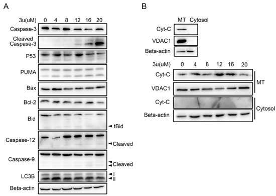 The expressions of p53, PUMA, Bax, and Bcl-2 were examined, but they were unchanged (Figure 3A). At the same time, autophagy did not appear because the ratio of Microtubule Associated Protein 1 Light Chain 3 Beta (LC3B)-I and II hardly altered (Figure 3A). Slight signals of truncated Bid (tBid), cleaved caspase-12 and cleaved caspase-9 were observed at all concentrations of 3u-treated A375 cells (Figure 3A). But it was not consistent with the cleavage of caspase-3, which was only observed at high concentrations. Possibly, these were just the background signal. We further explored whether cytochrome c (Cyt-C) was released from mitochondria. Cyt-C and Voltage Dependent Anion Channel 1 (VDAC1) existed only in mitochondrial proteins from untreated A375 cells (Figure 3B, upper). Hence, we successfully extracted mitochondrial protein from the whole lysis. However, the release of Cyt-C from mitochondria did not occur at all concentrations of 3u-treated A375 cells (Figure 3B, lower). Again, the results proved that slight signals of tBid and cleaved caspase-9 were just background signals.