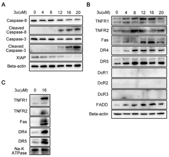 Figure 4. 3u-induced apoptosis was caused by upregulation of DRs and FADD via the extrinsic pathway. After 6 h of treatment of 3u in A375 cells (A) the extrinsic-related proteins were determined by Western blot analysis; (B) DRs and scaffold protein FADD, which initiated the death signal, were examined via immunoblot; and (C) membrane proteins were extracted, and DRs were determined by a western blot analysis.