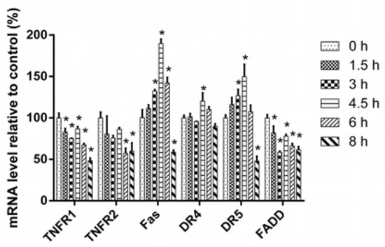 Figure 5. The relative mRNA expression results of DRs and FADD. Cells were treated with 16 µM of 3u for 0 h, 1.5 h, 3 h, 4.5 h, 6 h, and 8 h, and the mRNA relative expression level of DRs, FADD was detected by qPCR. The data were expressed as means ± SD (n = 3). *, p < 0.05 vs. 0 h group (unpaired Student’s t-test).