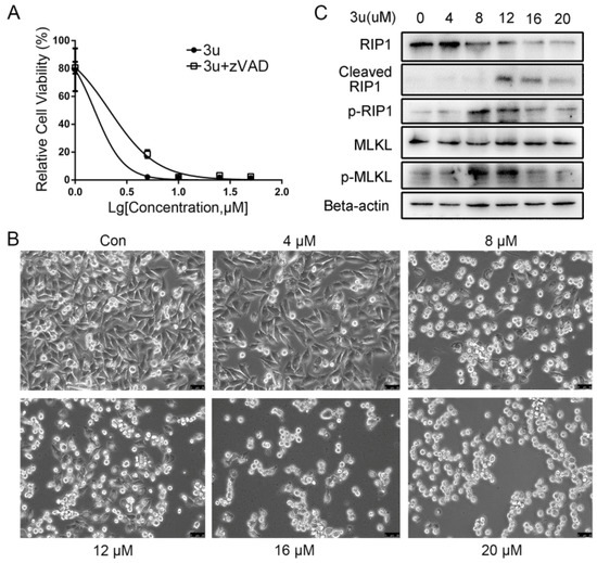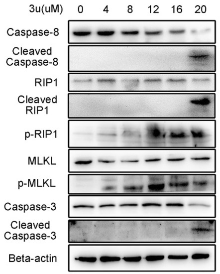 Unlike A375 cells treated with only 3u, phosphorylation of RIP1 and MLKL was observed at 4 µM, 8 µM, 12 µM, 16 µM, and 20 µM in which the phosphorylation signal of both proteins at 12 µM was stronger than others and the signals at 16 µM and 20 µM were much stronger than the blank control (Figure 7). This result indicated that necroptosis was activated at 12 µM, 16 µM, and 20 µM because caspase-8 was inhibited by zVAD-fmk and could not disable the kinase function of RIP1 by cleaving it. Apoptosis and necroptosis occurred concurrently at 20 µM.