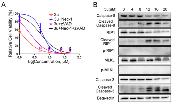 To further certify that 3u-induced cell death at low concentrations was necroptosis, A375 cells were treated by various concentrations of 3u (0 µM, 0 µM, 1 µM, 5 µM, 10 µM, 25 µM, and 50 µM), 30 µM zVAD-fmk and 20 µM RIP1 kinase inhibitor Nec-1, and an MTT assay was performed. More cells survived under the double treatment (3u+Nec-1) or triple treatment (3u+zVAD-fmk+Nec-1) than under the 3u treatment or 3u+zVAD-fmk double treatment (Figure 8A). The IC50 of the cells treated with 3u+Nec-1 was five-fold that of the 3u-treated cells (5.896 µM and 1.16 µM), while the IC50 of the cells treated with 3u+zVAD-fmk was double that of the 3u-treated cells (2.279 µM and 1.16 µM). The IC50 of the cells treated with 3u+zVAD-fmk+Nec-1 was slightly lower than in the cells treated with 3u+Nec-1 (5.029 µM and 5.896 µM). The results indicated that the inhibition of caspase-8 could not suppress 3u-induced cell death, while elimination of RIP1 kinase activity could survive 3u-treated cells to a certain extent. However, compared with the cells treated by 3u+Nec-1, the cells exposed to 3u+zVAD-fmk+Nec-1 could not survive at higher concentrations of 3u, which might be caused by the cytotoxic accumulation of the three compounds.