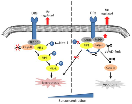 Caspase-8-mediated cleavage of RIP1 triggers the caspase cascade and induces apoptosis [19]. When caspase-8 is absent or inhibited, kinase-active RIP1 recruits and activates RIP3 and then phosphorylates MLKL, which induces necroptosis [21,22,48]. We found that 3u could induce caspase-3-dependent apoptosis in A375 cells at high concentrations (16 µM and 20 µM) via the activation of caspase-8, which was initiated by the upregulation of DRs and scaffold protein. At low concentrations of 3u (8 µM), necroptosis occurred because the upregulation of DRs and scaffold protein was weaker at low concentrations than at high concentrations. Twelve micromolar was a critical concentration because both necroptosis and apoptosis appeared at this concentration (Figure 4B). Thus sufficient activity of caspase-8 could accumulate to trigger apoptosis. ZVAD-fmk could suppress apoptosis and extend necroptosis at high concentrations of 3u. Nec-1 could inhibit necroptosis but could not influence apoptosis. Based on the above results, the activity of caspase-8 played a key role in determining the PCD type at high concentrations of 3u in A375 cells (Figure 9).