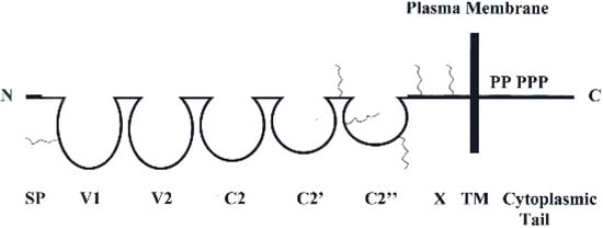Figure 1 shows the N-terminal extra-cellular domain of the protein, which is composed of a signal peptide sequence (SP) and five immunoglobulin-like domains and one X domain [