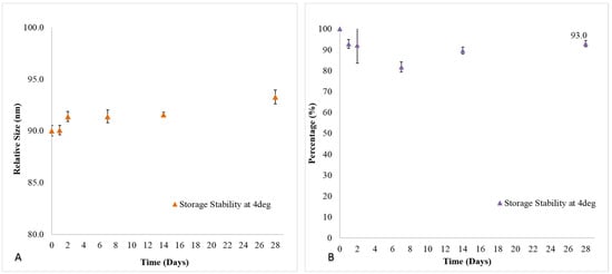 (A) Size and (B) drug loading stability of Senicapoc-loaded liposomal formulation at 4 °C storage conditions over a period of 28 days. All data are reported as mean ± SD of triplicates.