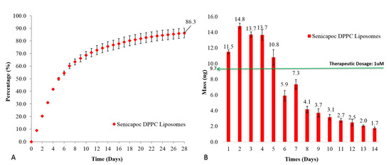 (A) Cumulative percentage release and (B) daily mass release of Senicapoc from drug-loaded liposomal formulation over a period of 28 days at 37 °C. All data are reported as mean ± SD of duplicates.