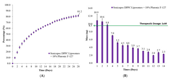 (A) Cumulative percentage release and (B) daily mass release of Senicapoc from drug-loaded liposomes dispersed in 18% hydrogel formulation over a period of 28 days at 37 °C. All data are reported as mean ± SD of duplicates.