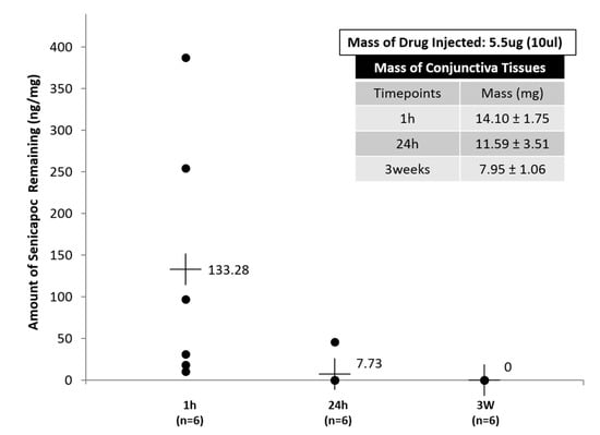 Residual Senicapoc concentration in sub-conjunctiva tissues at 3 different time-points (1 h, 24 h and 3 weeks). All data are reported as mean ± SD of n = 6.