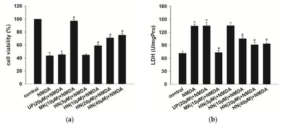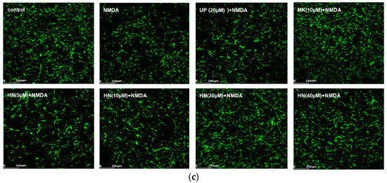 Effects of HN on NMDA-induced neuronal insults. (a) Pretreatment of HN (10 μM, 20 μM, 40 μM) improved cell viability compared with NMDA treatment group (p < 0.05); (b)Pretreatment of HN (10, 20, 40 μM) reduced LDH activity (U/mgPro) in cell supernatant induced by NMDA (p < 0.05); (c) Pretreatment of HN (10, 20, 40 μM) reversed NMDA-mediated the decrease in cell survival rate (p < 0.05). UP: unrelated peptide; MK: MK-801. Each value represents the mean ± S.E.M. of six independent experiments. * p < 0.05 vs. control group, # p < 0.05 vs. NMDA group.