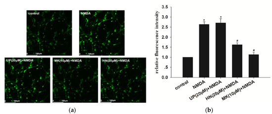 As shown in Figure 2, intracellular Ca2+ concentration ([Ca2+]i) after NMDA exposure of cortical neurons is 2.5 fold higher, when compared to the control (p < 0.05). MK-801 (10 μM) completely inhibited the increase, suggesting that the elevation of [Ca2+]i was caused by NMDA. Pretreatment with HN (20 μM) significantly extenuated intracellular calcium overload triggered by NMDA (p < 0.05). We also found that administration of UP (20 μM) did not inhibit NMDA-induced elevation of intracellular calcium (p > 0.05).