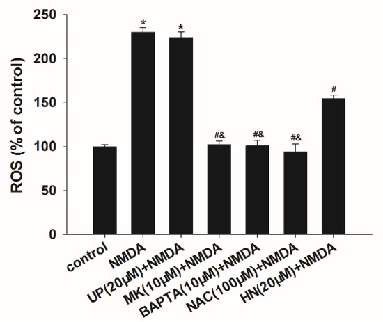 To clarify the time course of ROS generation during excitotoxicity, we measured the production of ROS and found that NMDA induced an increase of ROS with a peak response at six h (data not shown). NAC (N-acetyl-l-cysteine) is commonly used to identify and test ROS (reactive oxygen species) inducers, and to inhibit ROS generation. We respectively examined the effects of ROS scavenger NAC, neuroprotective peptide HN, and intracellular calcium chelator 1,2-bis(2-aminophenoxy) ethane-N,N,N’,N’-tetraacetic acid (BAPTA-AM) on ROS generation after NMDA treatment. As shown in Figure 3, administration of HN (20 μM) reduced NMDA-induced production of ROS by 45.71% (p < 0.05). MK-801 (10 μM), BAPTA-AM (10 μM) or NAC (100 μM) fully blocked NMDA-induced ROS generation (p < 0.05). Pretreatment of UP (20 μM) had no effects on NMDA-induced ROS generation (p > 0.05).