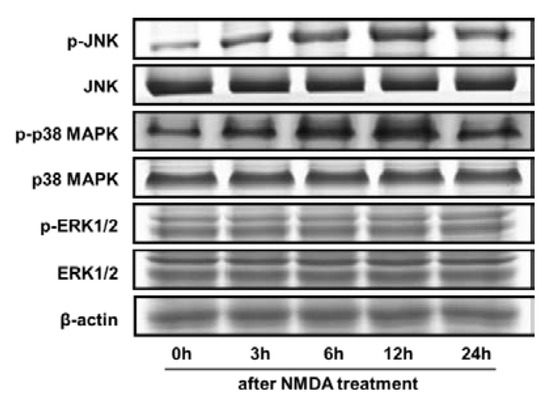 The time course of MAPKs activation in response to NMDA. Representative immunoblots depicting the phosphorylation of JNK, p38 MAPK, and ERK1/2 at 0–24 h after NMDA treatment. However, no significant changes were found in total forms. β-actin was used as a loading control.