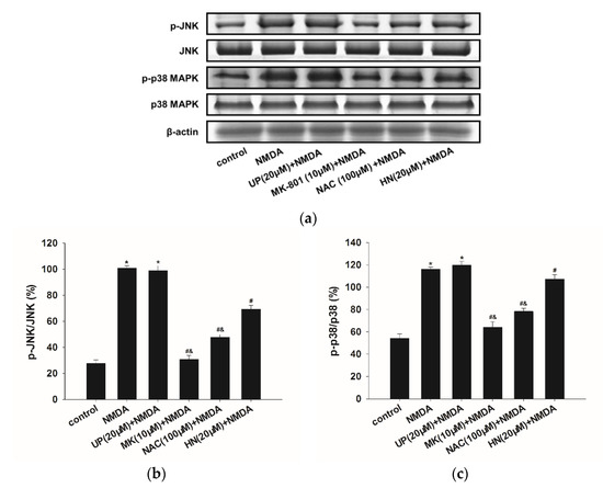 As shown in Figure 5, pretreatment of NAC (100 μM) significantly reduced NMDA-induced JNK and p38 MAPK phosphorylation (p < 0.05), which indicated the involvement of ROS in MAPKs signaling pathways. Similarly, HN (20 μM) also suppressed JNK and p38 MAPK phosphorylation (p < 0.05). In addition, there was a difference between the NAC + NMDA and HN group (p < 0.05). MK-801 (10 μM) completely blocked the effects caused by NMDA (p < 0.05). UP (20 μM) did not affect the expression of these proteins when compared with NMDA group (p > 0.05).