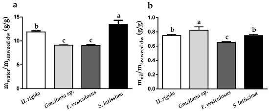 (a) water, and (b) oil holding capacity of Ulva rigida, Gracilaria sp., Fucus vesiculosus and Saccharina latissima. Different letters in the same graph indicate significant differences (p < 0.05).