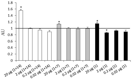 Effects of different doses of OmpF-EIII and different schemes of immunization on the content of anti-OmpF-EIII antibodies in mice blood sera. X-axis: Experimental groups of animals injected subcutaneously once (1), or twice at an interval of 7 days (1 + 7) or 14 days (1 + 14), with OmpF-EIII at doses of 20, 2, 0.2, or 0.02 μg/mouse. The experiment was terminated 28 days after the first immunization. Each experimental group included ten mice. The control group included mice injected with phosphate-buffered saline (PBS) containing 0.125% n-octylglucoside. The content of antibodies was evaluated by enzyme-linked immunosorbent assay (ELISA), and expressed as the ratio between the absorption in experimental groups and the control value equal to 1 (the horizontal line) (Y-axis). Data are presented in arbitrary units (AU). The dilution of mouse blood serum was 1/800. Bars represent mean ± SE. * p < 0.05 as compared with the control.