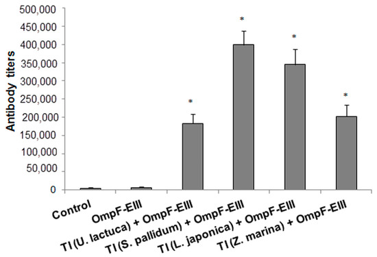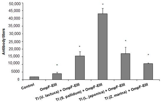 The content of the anti-OmpF-EIII antibodies in mice blood sera depending on the monogalactosyldiacylglycerol (MGDG) in the composition of the TI-complexes. Antibodies were evaluated by ELISA in mice blood sera after two immunizations with individual EIII-OmpF (OmpF-EIII) and OmpF-EIII incorporated in TI-complexes based on the MGDG from Ulva lactuca (TI (U. lactuca + OmpF-EIII)), Sargassum pallidum (TI (S. pallidum + OmpF-EIII)), Laminaria japonica (TI (L. japonica + OmpF-EIII)), or Zostera marina (TI (Z. marina + OmpF-EIII)), respectively, at a dose of 20 μg/mouse, administered subcutaneously at an interval of 14 days. The control group included mice immunized with PBS containing 0.125% n-octylglucoside. Each experimental group included ten mice. The experiment was terminated 28 days after the first immunization. Y-axis: The content of anti-OmpF-EIII antibodies in the experimental groups. Data are expressed in titers. Bars represent mean ± SE. * p < 0.05 as compared with the OmpF-EIII.