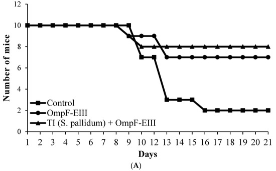 Protective activity was studied in the vivarium of the G.P. Somov Research Institute of Epidemiology and Microbiology, Vladivostok, Russia. The sanitary and epidemiological rules of the Russian Federation SR 1.3.3118-13 of 28 November 2013, were followed in animal experiments that were conducted according to the European Convention for the Protection of Vertebrate Animals used for Experimental and Other Scientific Purposes (Strasbourg, 18 March 1986). Three groups (10 animals in each) of BALB/c mice (males) with a weight of 18–20 g obtained from the ‘Pushchino’ nursery of laboratory animals, a branch of the Institute of Bioorganic Chemistry, RAS, were immunized twice subcutaneously according to the procedure described before (Section 4.5): (1) PBS containing 0.125% n-octylglucoside (control); (2) mice immunized with individual OmpF-EIII; (3) mice immunized with OmpF-EIII incorporated in the TI-complex based on MGDG from S. pallidum. Experiments were replicated three times.