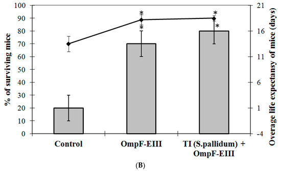 Protective activity of OmpF-EIII alone and OmpF-EIII incorporated into the TI-complex (TI (S. pallidum) + OmpF-EIII). (A) Number of mice surviving post infection with the tick-born encephalitis virus (TBEV) in groups of animals previously immunized twice with the OmpF-EIII alone (OmpF-EIII) and OmpF-EIII incorporated into the TI complex (OmpF-EIII + TI). Control represents a group of animals infected with TBEV without previous immunization. Each group contained ten animals. The duration of observation was 21 days post infection. (B) Percentage of survival (bars) in groups of animals: Control, OmpF-EIII, and TI (S. pallidum) + OmpF-EIII. Average life expectancy (line graph) in groups of animals: Control, OmpF-EIII, and TI (S. pallidum) + OmpF-EIII. Values are means ± SE for three independent experiments. The Fisher exact test was used to compare the protective activity in mice groups with the control. * p < 0.05 as compared with the control.