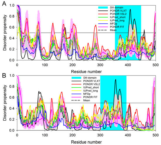 Intrinsic disorder predisposition of the chimeric OmpF-EIII protein (A) and the mature tick-borne encephalitis virus E protein (B) evaluated by several common per-residue predictors of intrinsic disorder, such as PONDR® VLXT (black line), PONDR® VSL2 (red line), IUPred_short (green line), IUPred_long (yellow line), MFDp (blue line), and PONDR® FIT (pink line). These computational tools were selected because of their different sensitivity to different disorder-related features. The bold, dashed dark gray line shows the mean disorder propensity calculated by averaging the disorder profiles of individual predictors. The light pink shadow around the PONDR® FIT curve shows the error distribution for this predictor, whereas the light gray shadow around the mean disorder propensity curve represents the distribution of standard deviations for this tool. The position of the DIII domain of the tick-borne encephalitis virus E protein (residues 354–447 of the chimeric protein) is shown by the light cyan bar. The most C-terminal part (residues 448–499 of the chimeric protein) corresponds to a stem of the E protein. In these analyses, the predicted intrinsic disorder scores above 0.5 are considered to correspond to the disordered residues or regions, whereas residues and regions with the disorder scores >0.2 are considered as flexible.