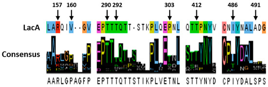 Amino acid consensus results for the alignment of 100 protein sequences with the sequence of LacA. Colors represent different residues generated automatically by the software.