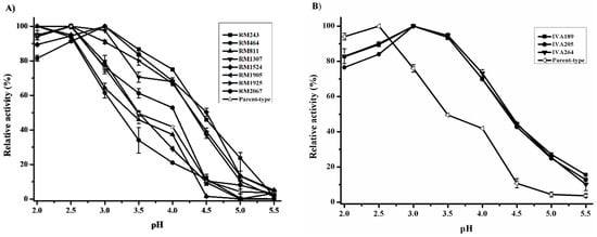 LacA has poor stability at pH values below 3.0 [20]. The laccase activity assay screenings were therefore performed at pH 4.0, which is an appropriate pH value for the present laccase applications. Therefore, a consequence of the selective pressure applied in the evolution should shift the pH profile to pH 4.0. The optimal pH of the parent laccase is 2.5, which was the same as that of the native laccase from Cerrena unicolor BBP6, and 41.8% relative activity was detected at pH 4.0 (Figure 3A). The pH profile of the mutants RM243 and RM1524 exhibited a switch in optimal pH from 2.5 to 3.0, retaining at least 75% and 68% relative activity between pH 2.0 and 4.0, respectively. The mutants RM1307, RM1905, and RM1925 showed the same optimal pH at 2.5, whereas the mutants RM1307 and RM1925 presented broader pH profiles and retained almost 40% residue activity at pH 4.5. Regardless of the improved activity, the mutants RM464, RM811, and RM2067 had narrow pH profiles and they showed almost no residual activity above pH 4.5. The optimal pH of these mutants was shifted to pH 2.0 (Figure 3A). Expectedly, the pH profile of the three positive mutants from the in vivo assembly libraries was homogeneous. The mutants presented the same optimal pH at 3.0, and 10–15% activity remained at pH 5.5 (Figure 3B). Accordingly, the beneficial mutations, V160D and T292N, were found in these mutants after assembly.