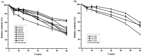 The thermostability was conducted by incubating the evolved laccases at 50 °C for 60 min. In contrast to the pH profiles, the thermostability of most mutants from the random mutagenic library was 100% conserved. The results showed that all mutants retained over 30% activity on ABTS upon incubation at 50 °C for 1 h. Notably, the mutants RM1307 and RM1925 displayed increased stability from 10–60 min, and the residual activity was more than two-fold that of the parent type. In contrast, the decreased stability of RM811 was found between 10–50 min (Figure 3C). As shown in Figure 3D, the thermostability of the evolved laccases was further improved after reassembling the above mutations. The relative activity of the evolved laccases was retained from 51% to 67% after a 1-h incubation at 50 °C. Moreover, the negative mutation R157P was absent in the mutated laccases after assembly.