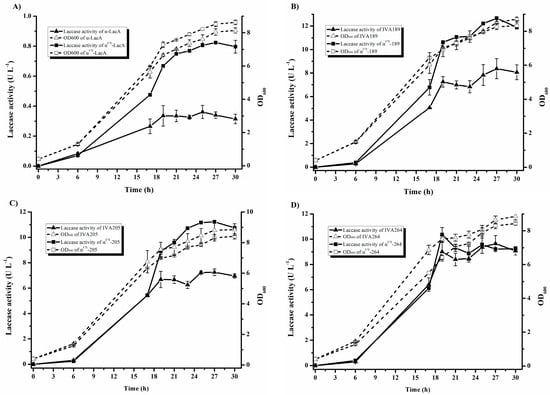 Cell growth and laccase production in S. cerevisiae BJ5465 expressing the parent-type laccase, LacA, and its mutants with the native α-factor and the evolved α-factor. (A) The parent-type laccase, LacA. (B) Mutant IVA189. (C) Mutant IVA205. (D) Mutant IVA264. The results represent the mean ± standard deviation of duplicate independent experiments (p < 0.01).