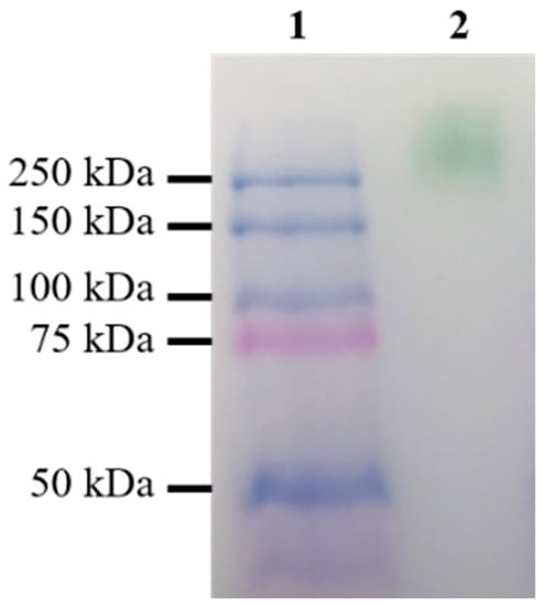 Native-PAGE of the parent-type laccase produced by S. cerevisiae BJ5465. Lane 1, Precision Plus Protein Dual Color S tandards; lane 2, the parent-type LacA.