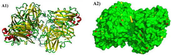 The parental laccase from Cerrena unicolor BBP6 was identified as a homodimer with a molecular mass of ~110 kDa in zymograph in our previous study [20]. The result of native polyacrylamide gel electrophoresis (PAGE) showed that the size of recombinant laccase was over 250 kDa (Figure 5). The high molecular mass suggests that this enzyme was expressed with a high degree of glycosylation in S. cerevisiae, as is consistent with the results of a previous report [22]. It also indicates that the recombinant laccase is still a homodimer. The LacA homodimer has two subunits, subunits A and B, corresponding to protein sequence chains A and B. The homodimeric laccase (Protein Data Bank ID: 3X1B) sharing 68.7% identity to LacA was used as the template for protein modeling. The three-dimensional (3D) structures were further repaired with FoldX to correct bad torsion angles and van der Waals clashes and to minimize the total energy. The final structure of the homodimer is shown in Figure 6(A1), demonstrating that the connection of subunits A and B was primarily mediated by four hydrogen bonds between the β-sheets at positions 266–268 and 761–763.
