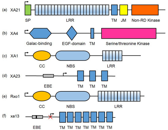 The protein domain structures of representative R-gene products for Xoo resistance. (a) Receptor kinase, including XA21 and XA3/XA26. XA21 is exampled for illustrations here; (b) Wall-associated kinase, XA4; (c) Nucleotide-binding leucine-rich repeat (NLR)-type, XA1; (d) Executor R proteins, including Xa10, XA23, and XA27. Xa23 is exampled; (e) Nonhost R protein from maize, Rxo1; (f) SWEET protein encoded by recessive type R genes such as xa13, xa25, and xa41. These recessive type R genes are evolved by mutation (black vertical line in the EBE box) in promoter to block transcription activator-like effectors (TALE)-induced susceptibility. xa13 is exampled here. SP: signal peptide; LRR: leucine-rich repeat domain; TM: transmembrane domain; JM: juxtamembrane domain; non-RD: non-arginine-aspartate domain; Galac-binding: galacturonan-binding domain; EGF: calcium-binding epidermal growth factor domain; CC: coiled-coil domain; NBS: nucleotide binding site; EBE: effector binding element. Arrow indicates the direction of transcription.