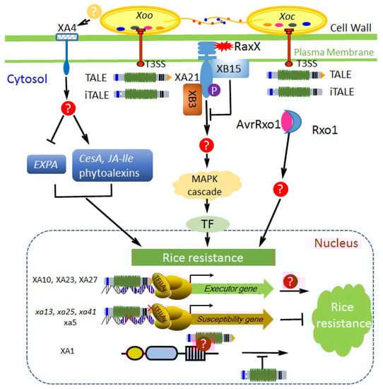 The known pathways of rice major resistance against X. oryzae. X. oryzae secretes virulence factors (multicolor oval) via protein secretion systems (e.g., T3SS) to benefit the pathogens, but some were recognized by R gene products in rice to trigger innate immunity. XA21 localized at the apoplast recognizes tyrosine-sulfated protein RaxX (red sharp shape) from X. oryzae and activates defense response by phosphorylating downstream targets. XB3, a ring figure ubiquitin ligase, is required for effective XA21-mediated resistance and may participate in activating the MAPK (mitogen-activated protein kinase) cascade. XB15, a PP2C phosphatase, dephosphorylates autophosphorylated XA21 and negatively regulates the resistance. XA4 is a cell wall-associated kinase and can be activated by ligands from Xoo, leading to induction of CesAs expression, inhibition of EXPA expression, and accumulation of JA-Ile and phytoalexins. AvrRxo1 (pink oval) is a Xoc-specific effector and can interact with a maize NLR protein Rxo1 (light blue crescent), resulting in hypersensitive response (HR) induction in rice. Executor R genes, recessive R genes, and Xa1-like NLR genes evolved in rice represent different strategies of countering TALE attacks. iTALEs from X. oryzae are suppressors of Xa1-mediated resistance. Question marks (?) in red and yellow backgrounds indicate the unknown interactors from rice and X. oryzae, respectively.