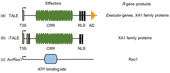 Structural features of identified effector proteins participating in induction or suppression of major R gene resistances. (a) The typical structure of TALEs. TALEs contain an N-terminal type III secretion and translocation signal (T3S), a specific central repeat region (CRR), three nuclear localization signals (NLS), and a C-terminal transcription activation domain (AD). TALEs play multiple roles in rice–X. oryzae interaction and can be recognized by executor and Xa1 family genes. (b) The structure of type-A iTALEs. iTALEs are truncated variants of TALEs. Boxes with stripes represent deletions. In X. oryzae, iTALEs are prevalent inhibitors of resistance of Xa1 family genes. The different structures endow TALE and iTALE with opposite functions. (c) AvrRxo1 is similar to the zeta toxin protein, and an ATP-binding site exists in the central region. The targeted R gene products involved in susceptibility or resistance induced by the effectors are shown on the right.