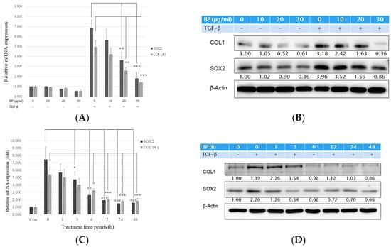 The most extensive evidence on the origin of the myofibroblast is from fibroblast transdifferentiation. Intensive studies have shown that TGF-β1 would induce a similar progression of pulmonary fibrosis in mice [18], where treatment of TGF-β1 in isolated lung fibroblasts induces fibrotic reaction such as collagen and cytokines expression [19]. To evaluate the effects of BP in lung fibrosis, we established an in vitro model using normal human lung fibroblast cell lines (NHLF). Previous studies have shown that TGF-β1 is an effective cytokine to induce various types of collagen [20]. After stimulating with exogenous TGF-β treatment, cells were treated with or without BP (0 to 30 µg/mL) for 24 h. As shown in Figure 1A, the mRNA levels of type I collagen α (COL1A1) were dramatically increased by TGF-β (1.0 vs. 4.9), but decreased in BP treatment groups. In addition, BP reduces mRNA and protein levels of type I collagen in a time-dependent manner (Figure 1C,D). The protein and mRNA levels in SOX2 were found to have similar trends (response to dosage) as those of type I collagen (Figure 1A,B). These results suggest that BP could reduce collagen production, and that it has a potential for treating lung fibrosis.