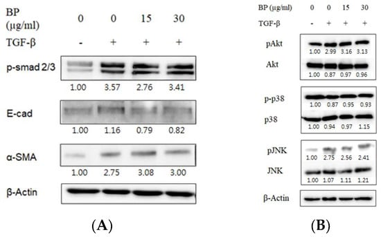 Previous reports have concluded that the role of TGF-β through the phosphorylation of Smad2/3 leads to the stimulation of ECM production in pulmonary fibroblasts [21]. In this study, TGF-β1 stimulation in normal lung fibroblast cell lines (NHLF) successfully upregulated in the expression of collagen and phosphorylation of Smad 2/3. Remarkably, BP did not reduce the phosphorylation of the downstream messenger of TGF-β, Smad2/3 (Figure 2A). Previous studies suggest that TGF-β-induced EMT results in the loss of E-cadherin expression, breaking the tight junctions in the epithelial type cells. However, in this study, the expression of E-cadherin was not changed by BP, as shown in Figure 2A, suggesting that BP would not alter the EMT status in lung fibroblasts. In this study, the NHLF treated TGF-β1 was sufficient to induce non-Smad pathways such as JNK, Akt, and p38 phosphorylation (Figure 2B). This treatment did not reduce the phosphorylation in these pathways, suggesting that BP would not alter the canonic TGF-β signal pathways.