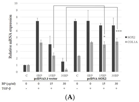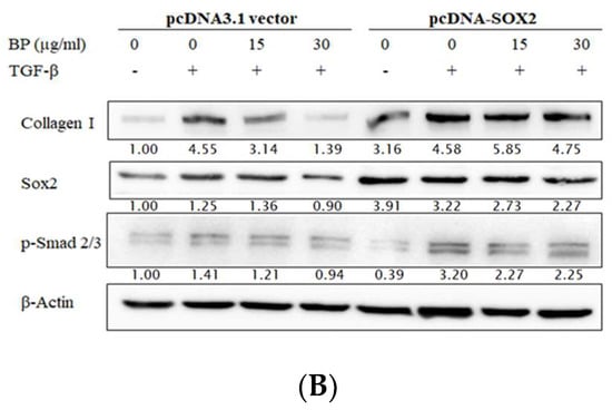 Although SOX2 plays an important role in fibroblast differentiation, the relationship between SOX2 and fibrosis is still unclear. Weina et al. proposed that SOX2 might be involved in the TGF-β signaling pathway and correlates it with melanoma aggressiveness and metastasis in human melanoma cells [22]. Our previous study has shown that BP reduced SOX2 expression and stemness in glioblastoma cancer stem cells [17]. In this study, SOX2 expression was reduced in a time-and dose-dependent manner in BP-treated NHLFs. In order to reveal the relationship between SOX2 and BP-reduced collagen production, we constructed a SOX2 coding sequence on the pcDNA3.1 expression vector. NHLF transfected pcDNA3.1/SOX2 increased mRNA (Figure 3A) and protein (Figure 3B) levels of SOX2. However, in SOX2-overexpressed cells, BP treatment did not decrease type I collagen in both mRNA and protein levels, while the vector control group still decreased SOX2 and collagen. These finding suggested that the expression of collagen might be correlated by SOX2.