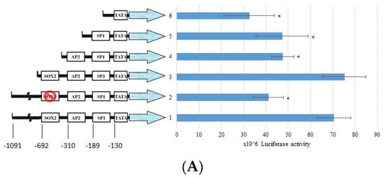 The promoter sequence of COL1A1 was divided into 4 parts which included a consensus SOX2 binding site (T/A)TTGTT (−724~+3), an AP2 (−342~+3), an SP1 (−221~+3) binding sequence, and a TATA box only (−177~+3), as described in [23], and these fragments were linked to the luciferase reporter vector pGL3-basic (Promega, Madison, WI, USA). A SOX2del of COL1A1 was conducted by removing the ATTGTT(−693~−687) in the promoter sequence, and cloned into the same vector. All plasmids were prepared and transfected by FuGENE HD® Transfection Reagent (Promega). The subsequent reaction was catalyzed and measured by Steady-Glo® Luciferase Assay System (Promega) and a luminance ELISA reader (Fluoroskan Ascent FL, Thermo Fisher Scientific, Cleveland, OH, USA), following the manufacturer’s instructions. The luciferase activity was obtained by three independent experiments, with six replicates for each group.