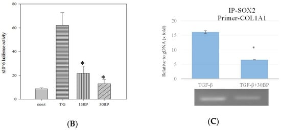 The regulation of collagen expression has been extensively studied, and components such as SP1 and AP2 contributing to its activity are already known. However, the consensus binding of SOX2 has still not been elucidated. To further elucidate whether the expression of collagen is reduced by BP, we constructed the type I collagen promoter sequence from −1091 to +3 of transcription starting site (TSS), as described in a previous report [23]. According to previous reports [24], the COL1A1 promoter has a consensus SOX2 binding sequence, (T/A)TTGTT. Thus, we divided the promoter sequence into (1) a full length of COL1A1 promoter; (2) a SOX2 binding site mutant construct; (3) a SOX2-AP2-SP1 binding site containing promoter; (4) a AP2-SP1 binding site containing promoter; (5) a SP1 binding site containing promoter; and (6) a TATA box only promoter (Figure 4A). The luciferase activity showed a significant decrease in both SOX2 binding site mutant and removal promoters, suggesting that the consensus SOX2 binding sequence, (T/A)TTGTT, could regulate the expression of COL1A1. To address whether BP might reduce the expression through the promoter regulation, we evaluated the luciferase activity in the condition of BP treatment (Figure 4B). The elevated luciferase activity in TGF-β-induced cells is significantly reduced by BP treatment (15, 30 µg/mL), and there was no difference between the control and BP treatment groups. To further define the binding characteristics of SOX2, we used chromatin immunoprecipitation to isolate the specific binding of SOX2 of the promoter sequence in TGF-β-induced NHLF cells. We found the consensus SOX2 binding site, (T/A)TTGTT, containing COL1A1 promoter existed in the anti-SOX2 bound amplicons. In the result of qPCR analysis, SOX2 binding amplicon was markedly decreased while NHLF was being treated by BP (16.12 vs. 6.56) (Figure 4C). These finding suggest that the expression of type I collagen could regulated by the promoter-binding ability of SOX2 in response to BP treatment.