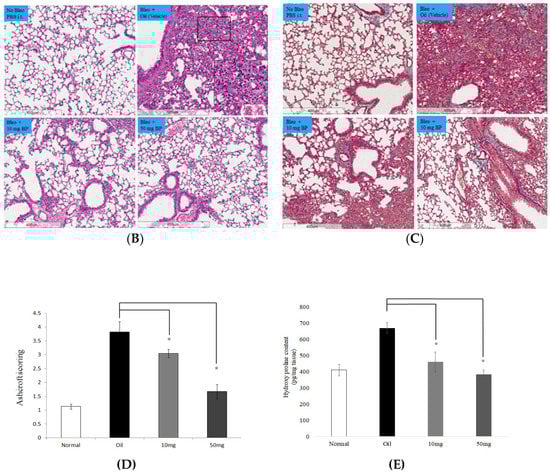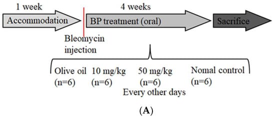 Male C57BL/6 mice were purchased from the National Laboratory Animal Center and animal studies were approved by the China Medical University Institutional Animal Care and Use Committee. Four-week aged mice were housed in a clean enclosure and allowed to accommodate for a week; they had free access to a standard diet. Bleomycin (0.045 U dissolved in 50 µL PBS) or PBS was then injected with intratracheal instillation into the mice, allowing a recovery of 3 days. Bleomycin-treated mice were then randomly grouped into BP treatment (10, 50 mg/kg) and olive oil (in both vehicle and no bleomycin controls) orally every other day (n = 6 in all four groups), as illustrated in Figure 5A. On Day 30, animals were sacrificed to collect bronchoalveolar lavage fluid (BALF) and lung tissue. BALF collection is performed using cold PBS (0.5 mL), which was gently injected and pulled out 5 times through the trachea with a syringe, then stored on ice. The BALF samples were performed by magnetic bead-based multiplex immunoassays (Bio-Plex) (BIO-RAD Laboratories, Milano, Italy) following manufactures’ instructions. Lung tissues were removed for histopathology and protein extraction, and divided into formalin fixation and −80 °C frozen storage, respectively. Fixed tissues were embedded and followed by H&E or Masson’s trichrome stain.