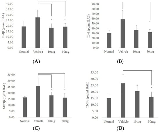 Data from BAL fluid investigation showed IL-1β, IL-6, Macrophage inflammatory protein-1β (MIP-1β), and TNFα (which was reported as pulmonary fibrosis-related cytokines in BAL [25]) significantly decreased in BP treatment groups (Figure 6A–D. p < 0.05). These results suggest that BP is effective in ameliorating pulmonary fibrosis in bleomycin-induced mice mediated both by reducing collagen fiber and decreasing fibrotic related cytokines.
