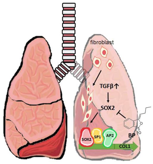 There has been evidence indicating the requirement of SOX2 expression in induced skin fibrosis, recruited into fibrotic lesions in response to bleomycin treatments [12]. There is also evidence of elevated SOX2 expression in IPF patients [13]. As such, we postulate a possibility of the requirement of SOX2 in pulmonary fibrosis. SOX2 exhibits pluripotent qualities, allowing cells to reprogram, but also induces tumorgenecity. In general, SOX2 functions and pathways are too complicated, making it difficult to explain its relationship with fibrogenesis. One possibility is that the specific promoter consensus sequences of SOX2, reported previously, drive expressions such as fibroblast growth factor 4 (Fgf4) [14]. Another author suggests that in bronchiolar Clara cells, SOX2 forms a complex with Smad3 and influences cell proliferation [15]. Nevertheless, these studies focus on the importance of SOX2 but not on the regulatory activity of its transcription. To address this, we have found in our previous studies that Butylidenephthalide (BP), also known as (3E)-3-butylidene-2-benzofuran-1-one in IUPAC, showed anti-fibrotic effects in the liver, with its mechanism enhancing Bone morphogenetic protein 7 (BMP7) expression and reducing TGF-β in hepatic stellate cells (HSC) [16]. The HSC functions as a fibroblast after EMT, and can be reduced through BP treatment. In addition, BP decreases the expression of SOX2 by reducing its metastasis and invasiveness in glioblastoma multiform (GBM) cell [17].