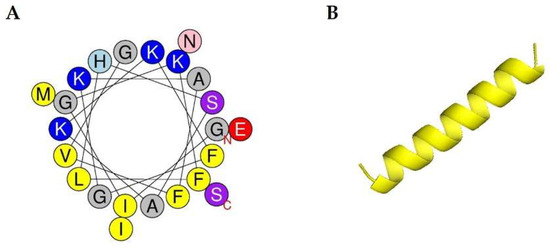 The magainin 2 sequence, observed molecular weight, hydrophobicity, hydrophobic moment, and net charge are summarized in Table 1. Magainin 2 is an antimicrobial peptide consisting of 23 amino acids with hydrophobic content, hydrophobic moment, and net charge of 0.373, 0.475, and 3, respectively. The wheel diagram and three-dimensional structure analysis predicted that the peptide contains hydrophobic residues (yellow circles) and forms an α-helix structure (Figure 1).
