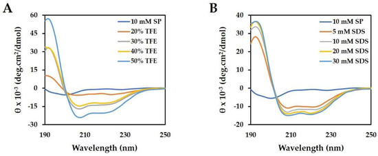 Circular dichroism (CD) spectra of magainin 2. (A) The peptide was measured in TFE, which mimics the hydrophobic environment of the microbial membrane and (B) SDS, which mimics the negatively charged prokaryotic membrane environment.