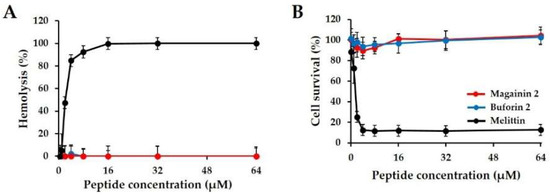 Cytotoxicity and hemolytic activity of magainin 2. (A) Hemolytic activity of peptides against mouse red blood cells (RBCs). (B) Cytotoxicity of peptides against HaCaT cells.