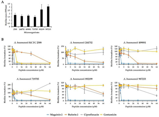 Effect of Acinetobacter baumannii biofilm formation by magainin 2. (A) Quantitative measurements of biofilm formation using crystal violet staining. (B) Inhibitory effect of peptides on biofilm formation. Antibiotics (ciprofloxacin and gentamicin) and buforin 2 were used as controls.