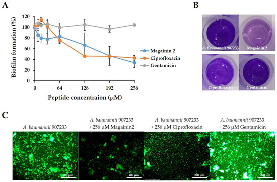Biofilm reduction assay. (A) Degree of biofilm removal by magainin 2, ciprofloxacin, and gentamicin using crystal violet staining. (B) Image of removed biofilm after treatment with 256 µM of peptide and antibiotics. (C) SYTO9-stained biofilm image.