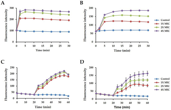 To investigate the mechanism of magainin 2 activity towards drug-resistant bacteria, A. baumannii 907233 was used, while A. baumannii KCTC 2508 as a control strain. First, the outer membrane permeability of A. baumannii 907233 following treatment with magainin 2 was examined using NPN dye (hydrophobic fluorescent dye, exhibits fluorescence intensity in a hydrophobic environment). The bacterial outer membrane was disrupted, and the hydrophobic part of the membrane was exposed, after which NPN reacted to show fluorescence. As shown in Figure 7A,B, the intensity increased in a concentration-dependent manner, indicating that magainin 2 acts on the outer membrane. For A. baumannii KCTC 2508, the fluorescence intensity rapidly increased to 268, 246, and 209 within 2 min at 4×, 2×, and 1× MIC, respectively. In contrast, fluorescence increased to approximately 80 in A. baumannii 907233.