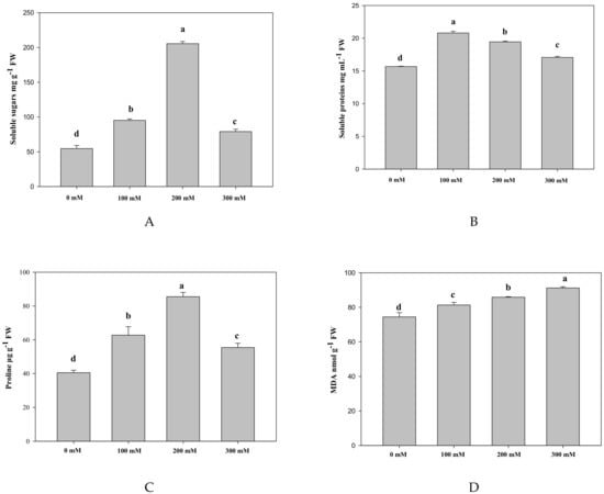 Effects of different concentrations of NaCl on soluble sugars (A), soluble proteins (B), proline (C), and MDA (D). Bars are expressed as the mean ± SD (n = 3). Bars carrying different letters are significantly different at p < 0.05.