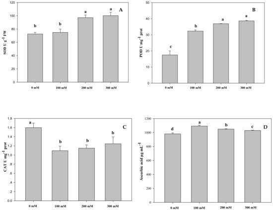 It can be observed from Figure 2 that the activity of superoxide dismutase (SOD) was significantly increased under moderate stress and severe stress with respect to the control. Peroxidase (POD) activity was noticeably enhanced, specifically under severe stress, increased to 38.66 U mg−1 prot, about 2.2-fold compared with the control (Table S1). However, catalase (CAT) activity in salt-treated AVF was significantly declined compared to the control, but it was elevated with the increasing salt concentrations from 100 to 300 mM (Table S1). Significant change was shown between any two groups of ascorbic acid ranging from 980.9 to 1095 μg mL−1, but it was moderately higher in the salt-treated groups than in the control.