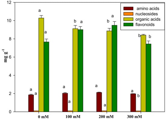 Compared with the control, there was no significant change in asparagine, a higher content of amino acids in AVF, except for 200 mM of salinity stressed group (Table S4). The content of glutamine, proline, and glutamic acid changed notably between any two groups, while the change in the total amino acids was non-significant (Figure 3). Little change was detected on the total nucleosides except for the 300 mM NaCl stressed group. By comparison with the control, the accumulation of inosine and thymidine were considerably reduced. The content of neochlorogenic acid and the total organic acids under salinity stress was significantly reduced, but the change in caffeic acid was different. Compared to the control, kaempferol 3-O-rutinoside, gallocatechin, and epigallocatechin were significantly increased under salt stress, and significant differences were shown from each other. The accumulations of hyperoside, isoquercitrin, astragalin, trifolin, and total flavonoids were changed similarly, increasing first and then decreasing with the increasing salt concentrations.