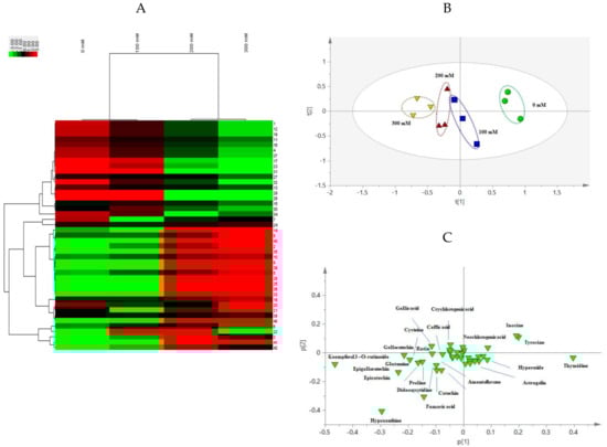 A heat map derived from hierarchical clustering analysis intuitively displayed the changes of the accumulation of 43 bioactive components under salinity stress (Figure 4A), and on the other hand, the clustering of samples. In detail, 0 and 100 mM salt treated samples, and 200 and 300 mM salt treated ones were clustered separately and then gathered together. Principal component analysis (PCA) scores plot (Figure 4B) exhibited a statistical distinction based on 43 compositions under salinity stress with R2X [1] and R2X [2] accounted for 47.0% and 16.6% of the total variance, respectively [11]. In the PCA loading plot, chemical markers possessing large loading values of ions, such askaempferol 3-O-rutinoside, hypoxanthine, and thymidine strongly contribute to sample classification. Additionally, gray relational analysis (GRA) is part of the grey system theory and is suitable for solving problems with complicated interrelationships between multiple factors and variables. It provides a reliable guarantee for the quality evaluation of traditional Chinese medicines. The relative correlation degree (ri) derived from GRA is proportional to the sample quality. Thus, the quality order of AVF under different NaCl treatments was: 200 mM salinity stressed group > 100 mM salinity stressed group > 300 mM salinity stressed group > control, and the corresponding values of ri were 0.6363, 0.5253, 0.4827, and 0.3984, respectively. These directly revealed that the accumulations of metabolites were affected under saline condition in AVF (Table 2).